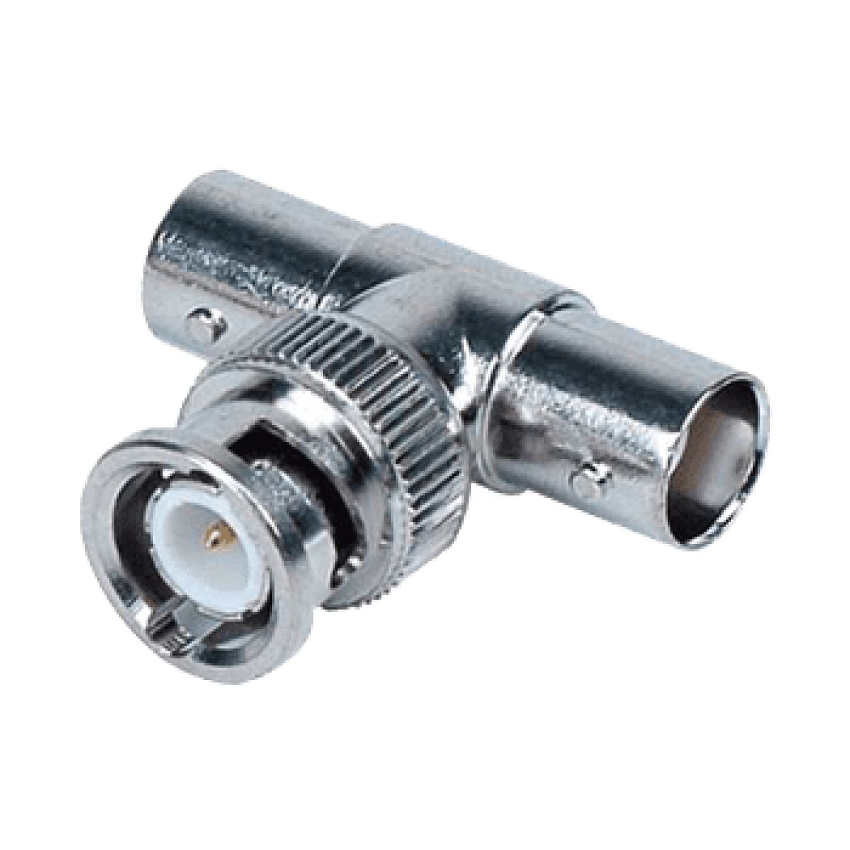 Derivador "T" BNC SAFIRE macho a 2 BNC fêmea. Permite extrair o sinal de um conector BNC a dois conectores, com o fim de partilhar o sinal.