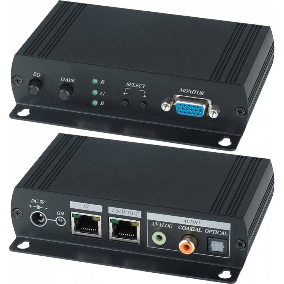 Recetor de sinal VGA e Áudio stereo, para trabalhar com os emissores GVE2AL e GVE5AL e com correção de imagem. Distância até 300m dependendo da resolução da imagem e resolução até 1600x1200 pixels. Ajuste de contraste e brilho. Transmissão digital de áudio.