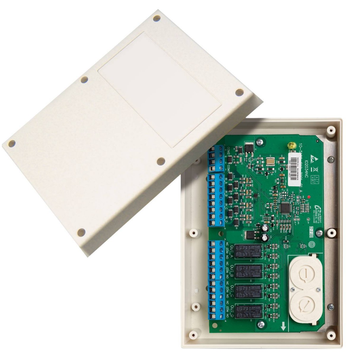 Módulo com quatro entradas de alarme e quatro saídas de relé (2A 24Vcc). As entradas têm supervisão da linha, com conexão de um contato NA, ocupa um endereço no circuito e é alimentado a partir dele. LED indicador de estado.