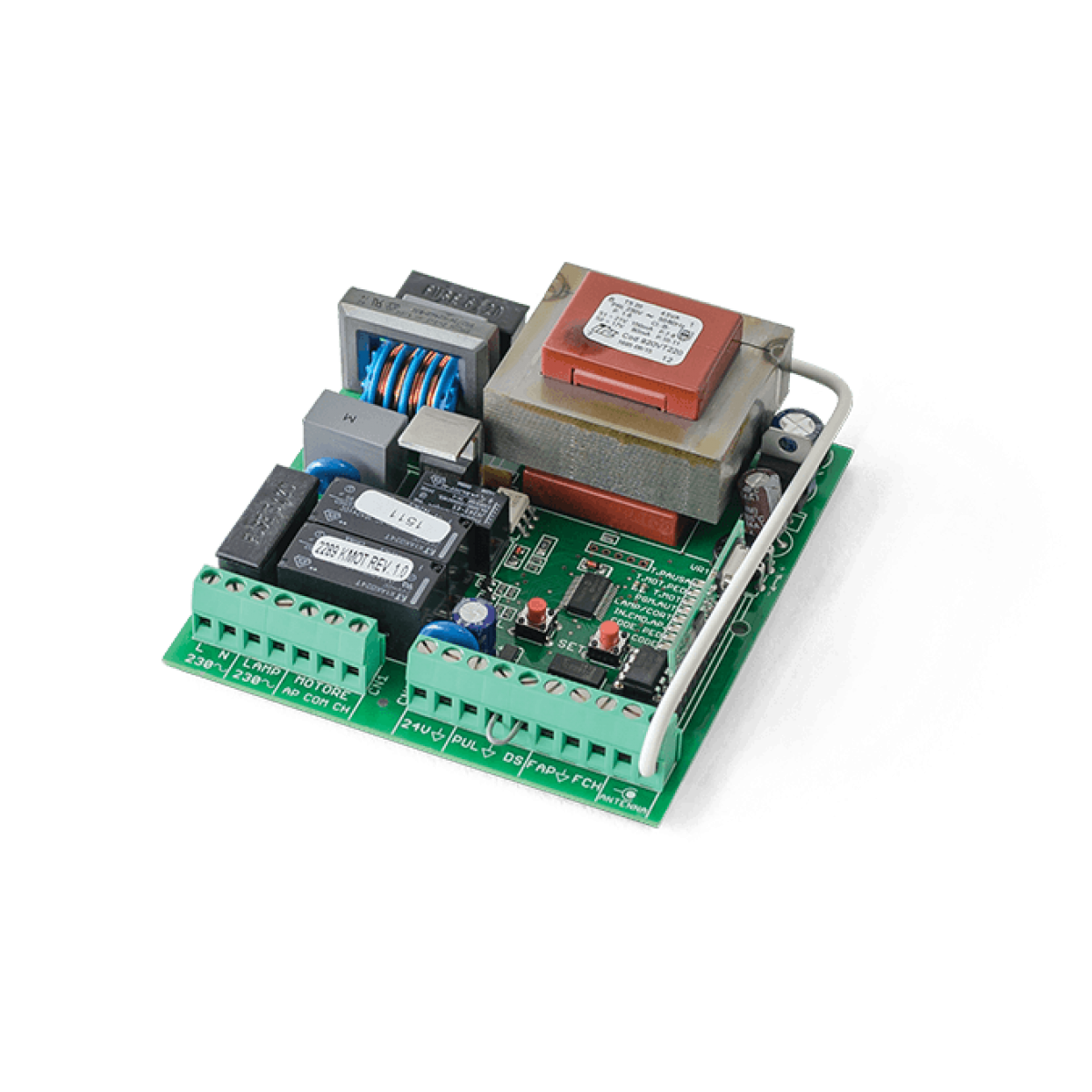 Central eletrónica monofásica de 230V para portões de correr com recetor incorporado e possibilidade de guardar na memória 215 códigos Rolling Code.