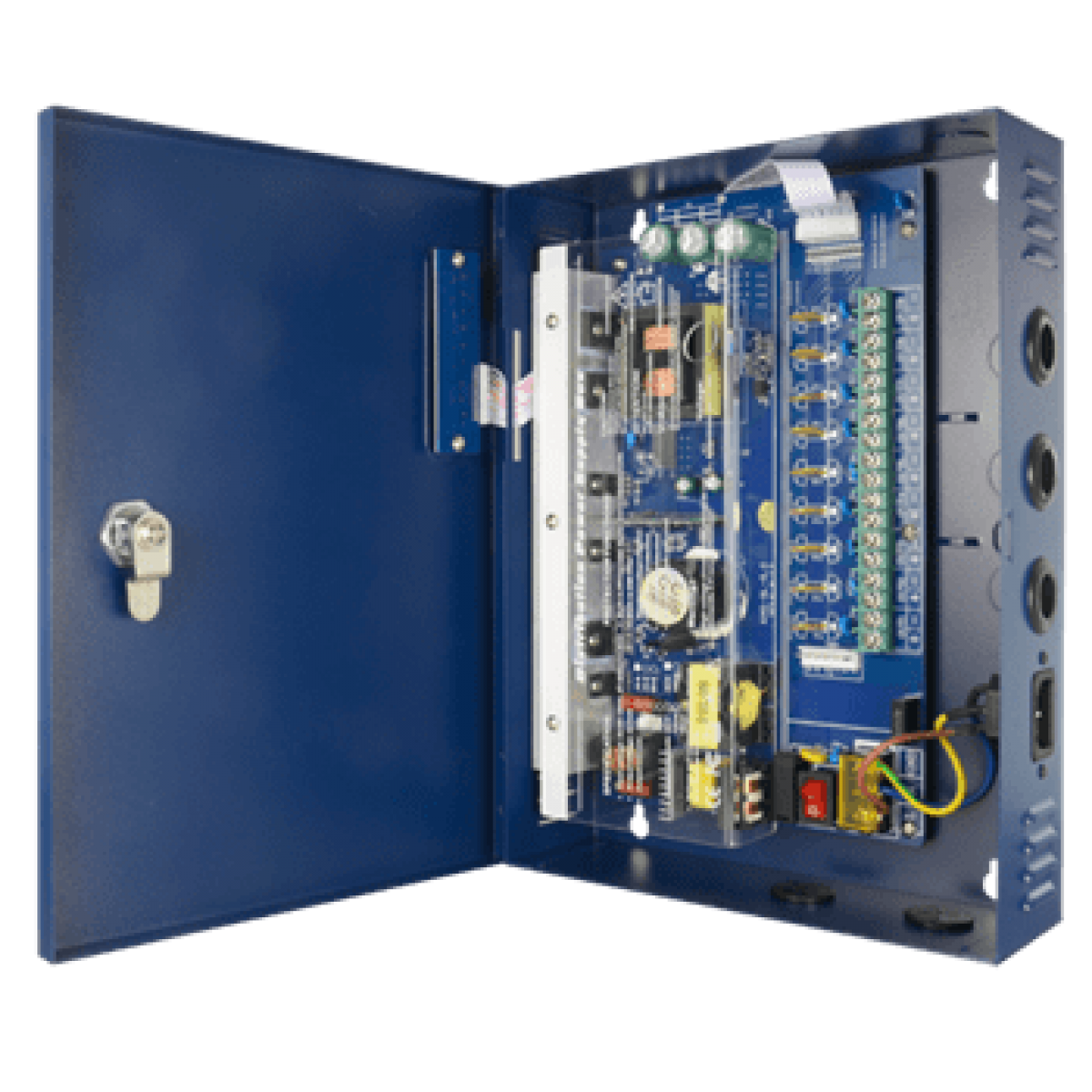 A fonte de alimentação fica alocada num armário metálico, com guarnições para cabos isoladas e fechamento com chave para maior proteção. Na parte dianteira dispõe de um indicador com LEDs de estado para cada saída com o objetivo de facilitar tanto a instalação como a manutenção.