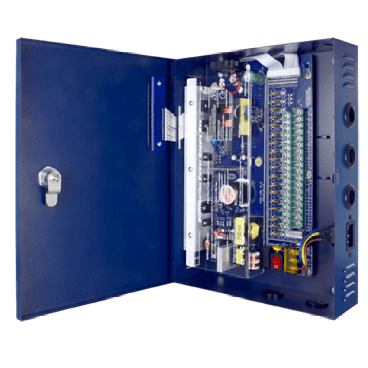 Caixa de distribuição de alimentação profissional. Utiliza-se como fonte de alimentação centralizada para várias câmaras ou outros dispositivos de segurança, oferecendo proteção individualizada.
